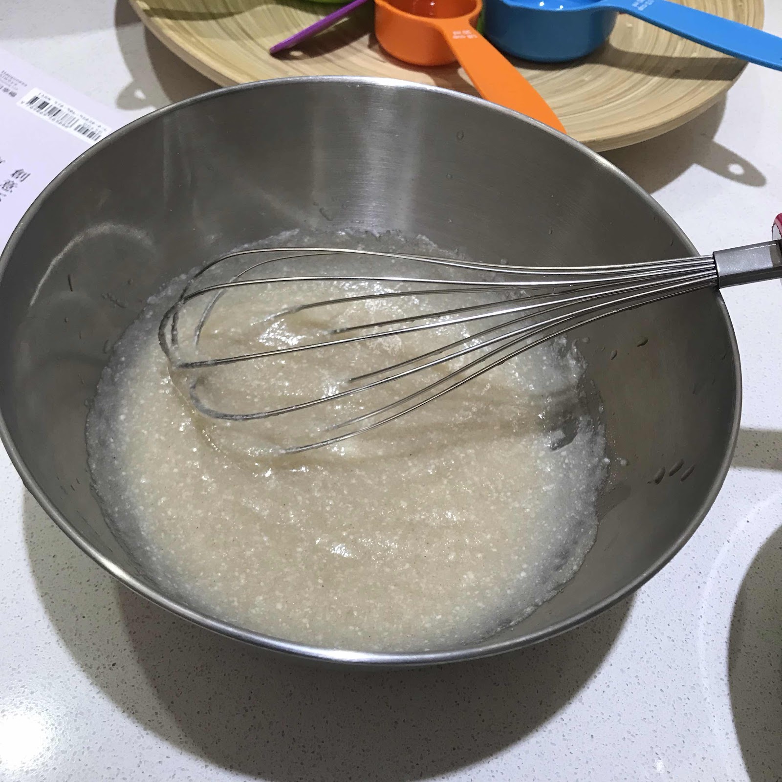 水.洋車前子粉.椰子粉確認混合均勻後,加入六顆蛋白,此時你一定會有點氣餒,怎麼它們和新朋友蛋白哥蛋白哥那麼不合互相排斥,讓本來均勻的原料變成很噁心的塊狀,但不用擔心,他們都是害羞慢熟型的,請繼續攪拌等待他們手牽手的奇蹟